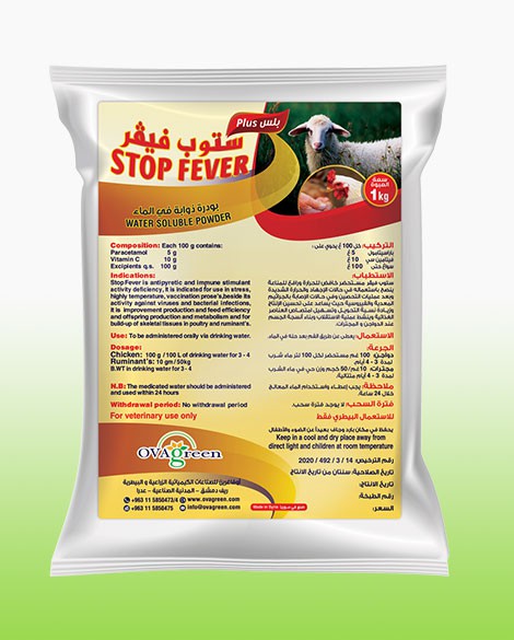 ستوب فيفر بلس مستحضر خافض للحرارة ورافع للمناعة ينصح باستعماله في حالات الاجهاد والحرارة الشديدة وبعد عمليات التحصيـن وفي حالات الإصابة في الجراثيـم المعدية والفيروسية حيث يساعد على تحسين الإنتاج وزيادة نسبة التحويل وتسهيل امتصاص العناصر الغذائية وينشط عملية الاستقلاب وبناء انسجة الجسم عند الدواجن والمجترات.