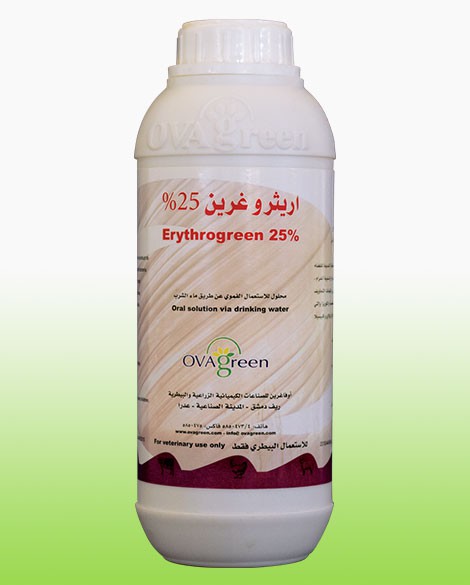 يعتبر أريثروغريـن 25% من المستحضرات ذات الفعالبـة الشديدة للقضاء على مجموعة واسعة من الجراثيم الموجبة والسلبية الغرام ويوصى باستعماله لعلاج أمراض الجهاز التنفسي والتهاب التجاويف الانفية والرشح المزمن والمعدي والتهاب الأغشية المفصلية و الكوريزا و التي تسببها جراثيم الستربتوكوكس و الستافيلوكوكس و الاي كـولاي و كلبيسيلا و الشـيجيلا و الهيموفيلس و الميكوبلازما فـي الدواجـن.