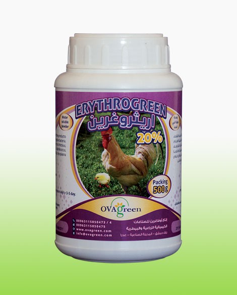 يعتبر اريثروغرين من المستحضرات ذات الفعالية الشديدة للقضاء على مجموعة واسعة من الجراثيم الموجبة الغرام والسالبة الغـرام و يوصى بإسـتعماله لعـلاج امـراض الجهاز التنفسي والتهابات التجاويف الانفية والرشح المزمـن والمعـدي والتهاب الاغشـية المفصلية والكوريزا والتي تسببها جراثيم الستربتوكوكس والستافيلوكوكس والاي كـولاي وكلبسيلا والشيجيلا والهيموفيلس والميكوبلازما في الدواجن.